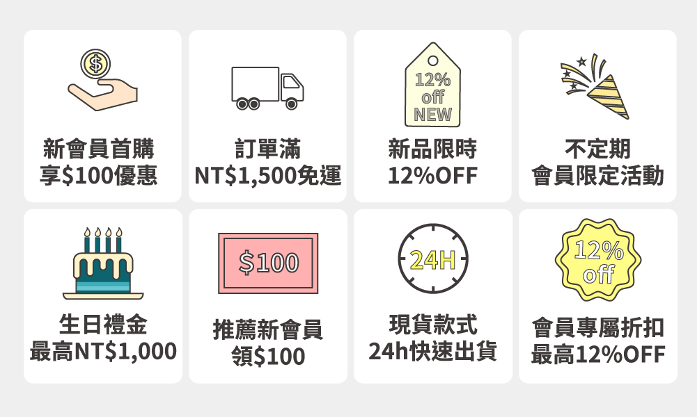 4.生日優惠:系統將自動於會員生日當日發送購物金,使用期限為 30 天。
