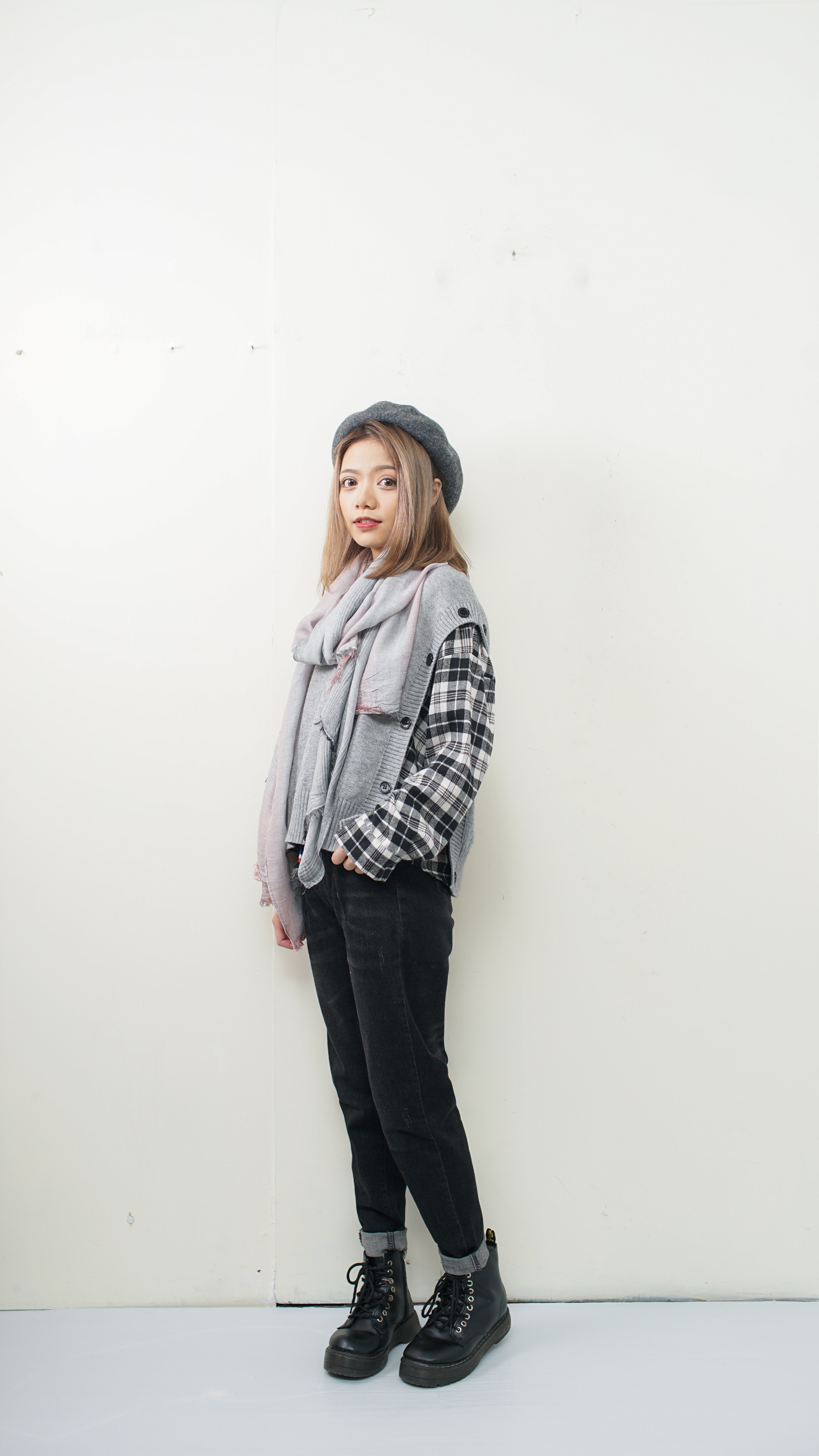 上身搭配有設計感的仿兩件式格紋毛衣,