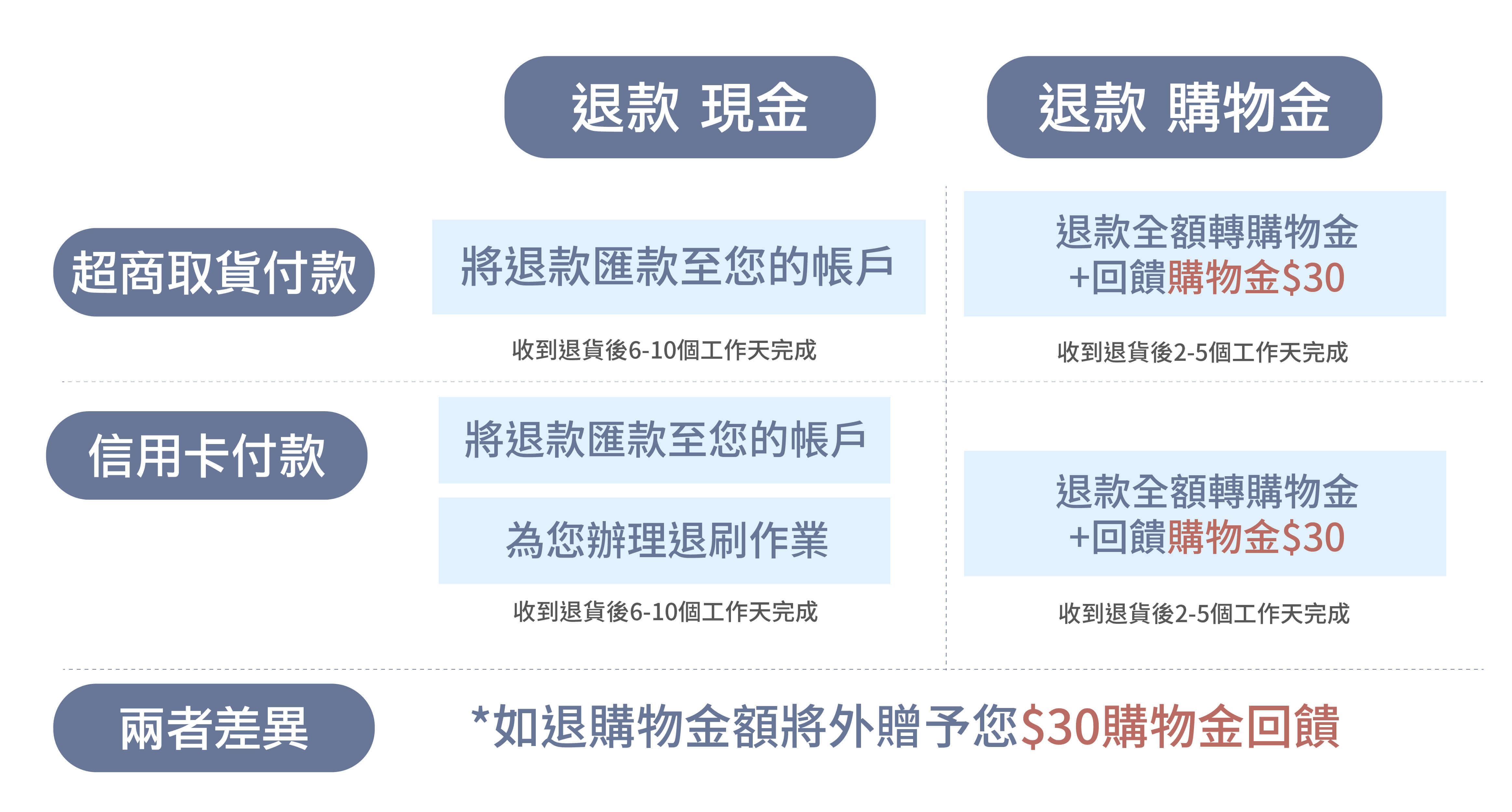 (1)購物金:收到退貨後2-5個工作天內退至您的帳號