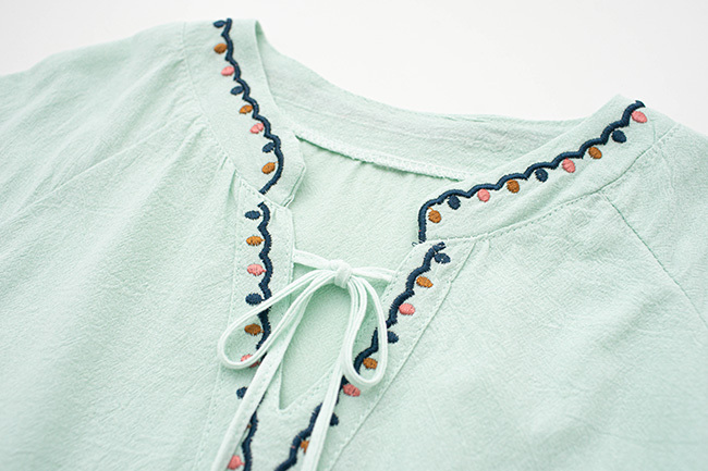 立領綁帶繡花上衣貓咪口袋竹節棉九分褲組合