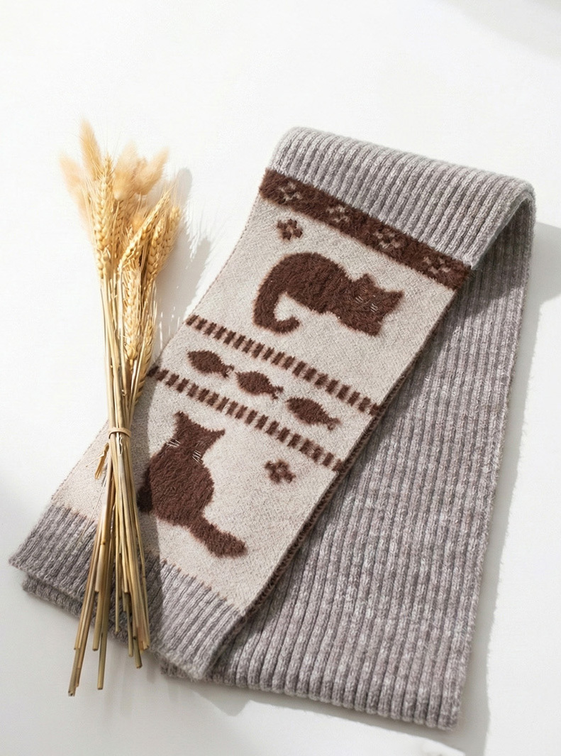 日系童趣貓咪緹花親膚針織圍巾
