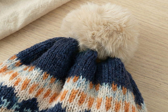 北歐圖騰加絨護耳球球造型針織帽