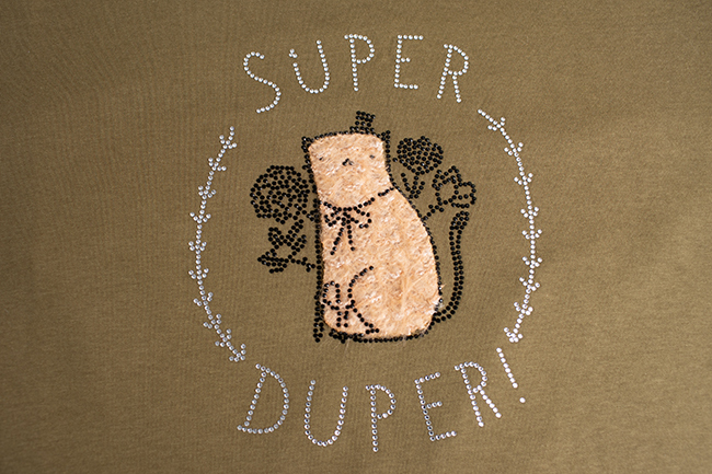 上身點綴俏皮的貓咪圈圈毛植絨圖案,結合精緻的燙鑽細節