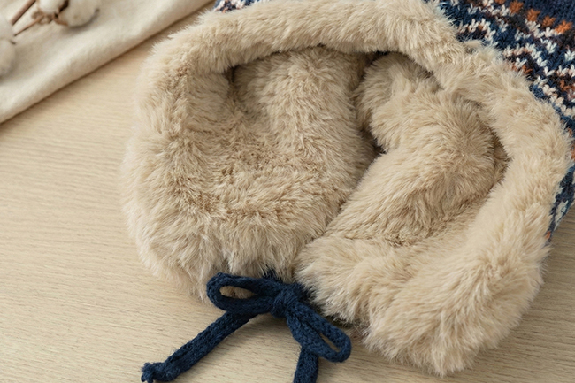 北歐圖騰加絨護耳球球造型針織帽